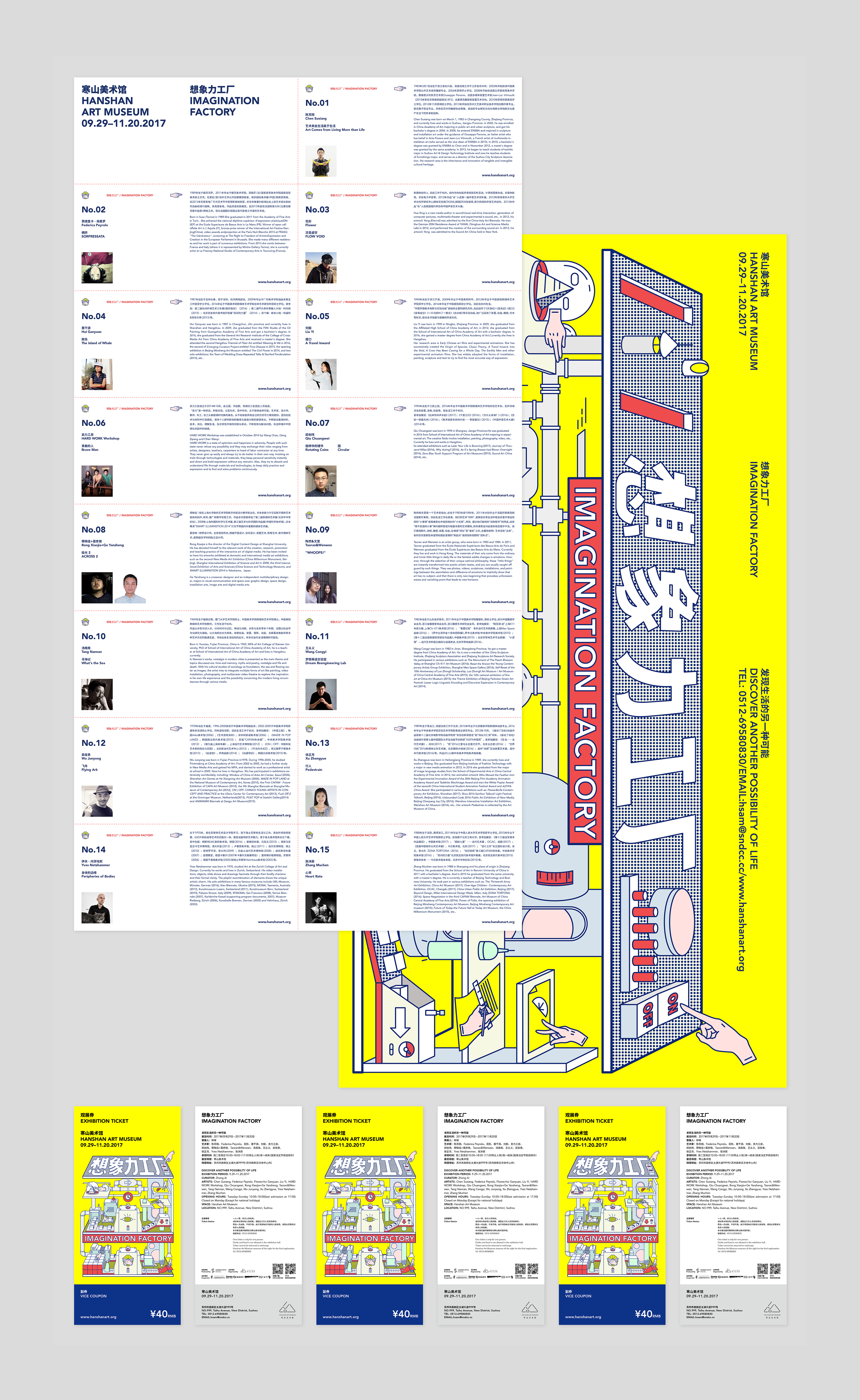本次当代艺术展旨在为观众从形象、观念、情感和想象等方面提供一场“日常之外”的观看,并突破感官边界。依据展览主题“想象力工厂”展开主视觉设计,我们根据想象力的词义,分别利用意识的创造者“大脑”、意识的接收者“眼睛”与意识的执行者“手”三者构成“想象力”第一人称主体。我们用图形构建了一个可视化“工厂”,这个主体与“工厂”共同协作,“想象力”由此诞生。